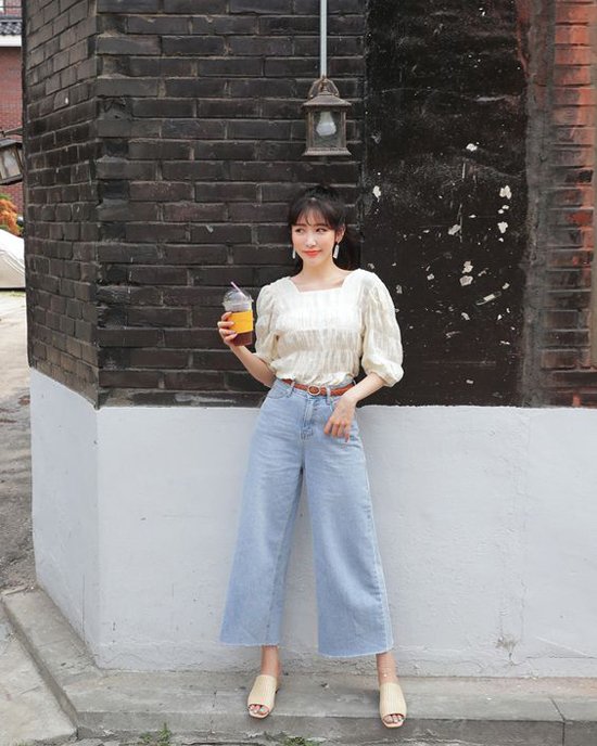 Quần jeans cạp cao khi mặc cùng áo tay phồng croptop sẽ không chỉ giúp nàng khoe vòng 3 đầy đặn mà còn có thể giúp che đi khuyết điểm vòng 2 lộ ngấn mỡ đấy nhé.