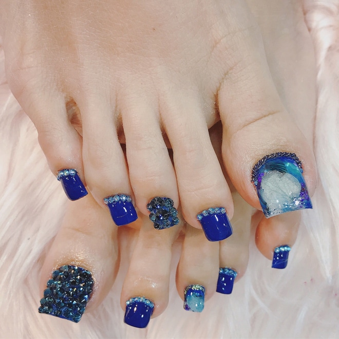 Màu xanh sapphire là một màu rất nịnh mắt được nhiều người thích thú khi sử dụng. Họ mang vẻ đẹp quý phái, lộng lẫy làm lay động biết bao người. Màu sơn kết hợp với họa tiết và phụ kiện lấp lánh sẽ tạo nên những mẫu nail cầu kỳ. Chúng hứa hẹn sẽ giúp làn da của bạn tươi trẻ, rạng rỡ.