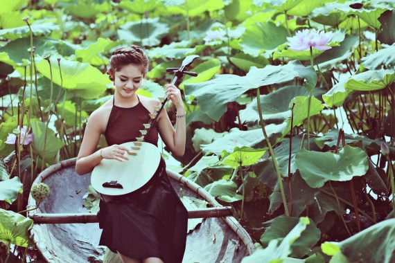 Bạn có thể tham khảo những bức hình dưới đây, các cô nàng trong các tư thế chụp ảnh với hoa sen và mang thêm một chiếc đàn tỳ bà – vật dụng quen thuộc của dân gian Việt Nam.